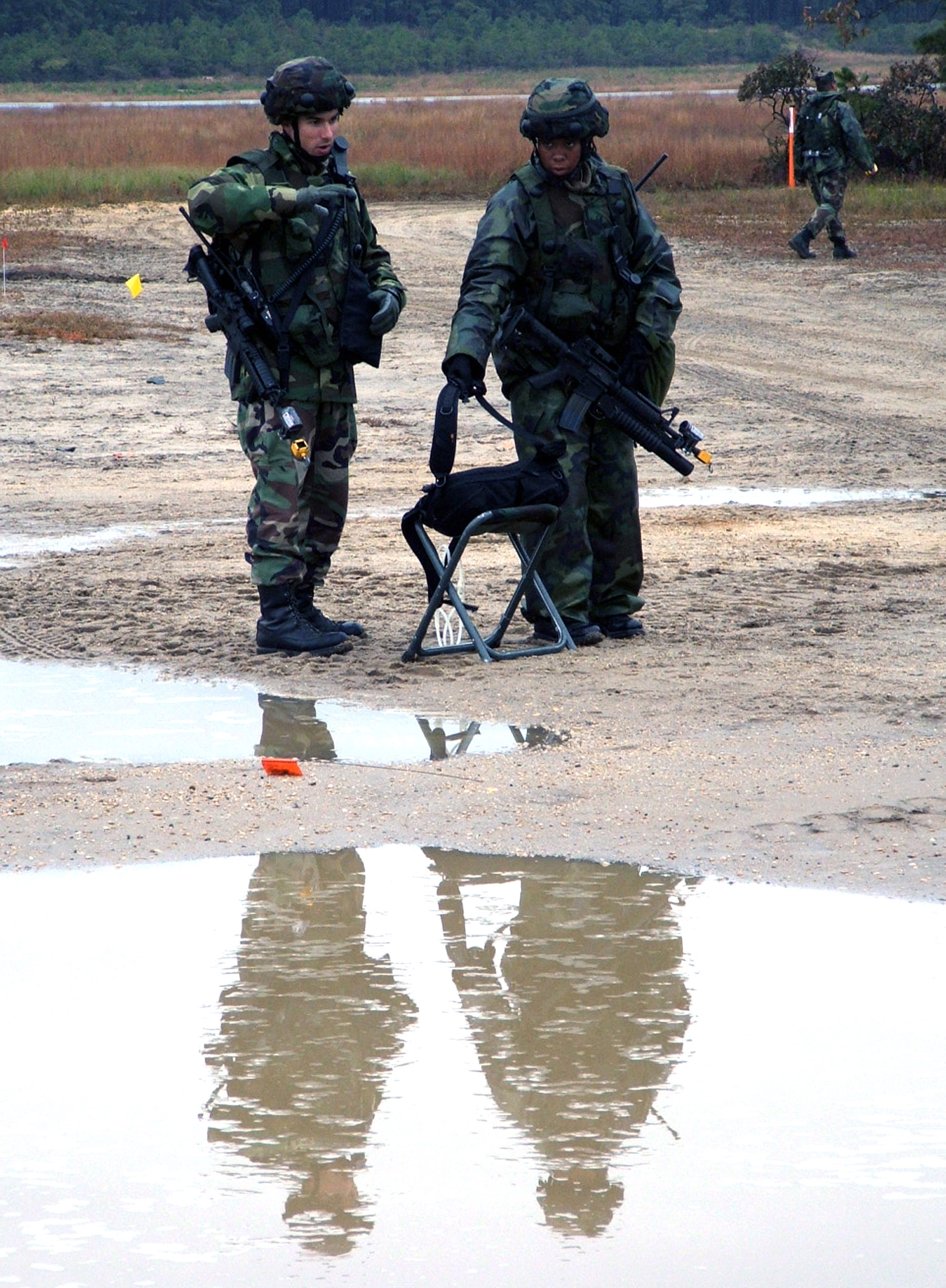 NAVAL AIR ENGINEERING STATION LAKEHURST, N.J. (AFPN) -- Capt. Kevin Walker and Senior Airman Winter Gibson figure out how to set up force protection measures at their camp here. The Airmen, from the 613th Security Forces Squadron at Andersen Air Force Base, Guam, deployed here in support of exercise Eagle Flag 06-1, which began Oct. 21. (U.S. Air Force photo by Tech. Sgt. Scott T. Sturkol))